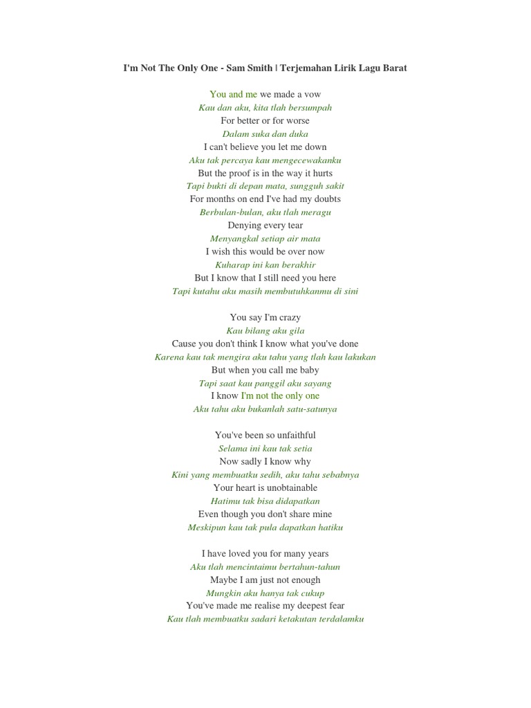 Im Not The Only One - Sam Smith Terjemahan Lirik Lagu Barat You and me we made a vowKau dan aku kita tlah bersumpah For better or for worseDalam suka dan duka I cant believe you let me downAku tak percaya kau mengecewakanku But the proof is in the way it hurtsTapi bukti di depan mata sungguh sakit. You and me we made a vow Kau dan aku kita tlah bersumpah For better or for worse Dalam suka dan duka I cant believe you let me down Aku tak percaya kau mengecewakanku. Lirik Lagu Im Not The Only One - Sam Smith dan Terjemahan Sam Smith - Im Not The Only One.